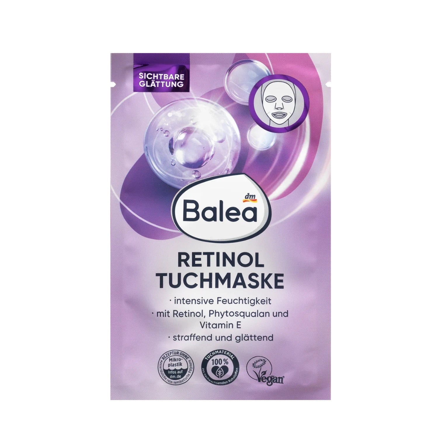 Η μάσκα σεντόνι Balea retinol με επιλεγμένο σύμπλεγμα δραστικών συστατικών ρετινόλης, φυτοσκουαλάνης, υαλουρονικού οξέος και βιταμίνης Ε έχει εντατική ενυδατική δράση και χαρίζει στο δέρμα αισθητή ελαστικότητα. Η ρετινόλη και η βιταμίνη Ε προστατεύουν το δέρμα από το αντιοξειδωτικό στρες και τις ελεύθερες ρίζες. Η σύνθεση μπορεί να επιταχύνει την ανανέωση των κυττάρων και κάνει την επιφάνεια του δέρματος να φαίνεται πιο λεία και τα χαρακτηριστικά του προσώπου πιο σφριγηλά. Οι λεπτές γραμμές και οι ρυτίδες εμφανίζονται πιο ομαλές.