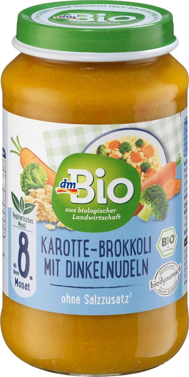 Το χορτοφαγικό μας βάζο μενού καρότου-μπρόκολου dmBio με νουντλς μπορεί να σερβιριστεί ως ζεστό γεύμα από τον 8ο μήνα.